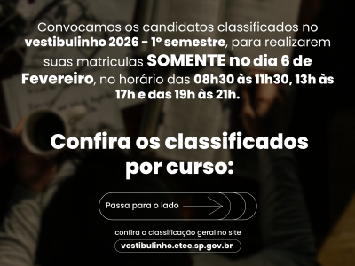 Saiu a 3ª Chamada, ainda dá tempo de garantir sua vaga! Confira a nova lista de classificados para os cursos Técnicos e Ensino Médio. O prazo de matrícula é curto: dias 02 e 03 de fevereiro. Saiba como enviar sua documentação online ou presencialmente.