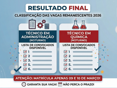 Saiu a 3ª Chamada, ainda dá tempo de garantir sua vaga! Confira a nova lista de classificados para os cursos Técnicos e Ensino Médio. O prazo de matrícula é curto: dias 02 e 03 de fevereiro. Saiba como enviar sua documentação online ou presencialmente.