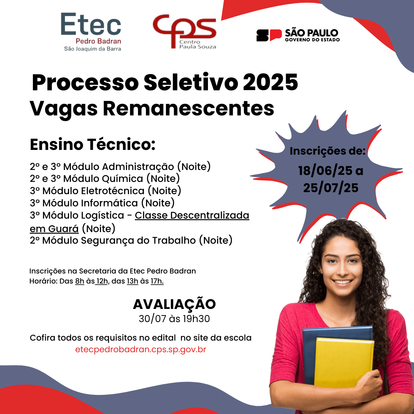 A Etec Pedro Badran informa que estão abertas as inscrições para o processo seletivo de vagas remanescentes nos cursos técnicos e no Ensino Médio com Habilitação Técnica (M-Tec) para o 2º semestre de 2025.