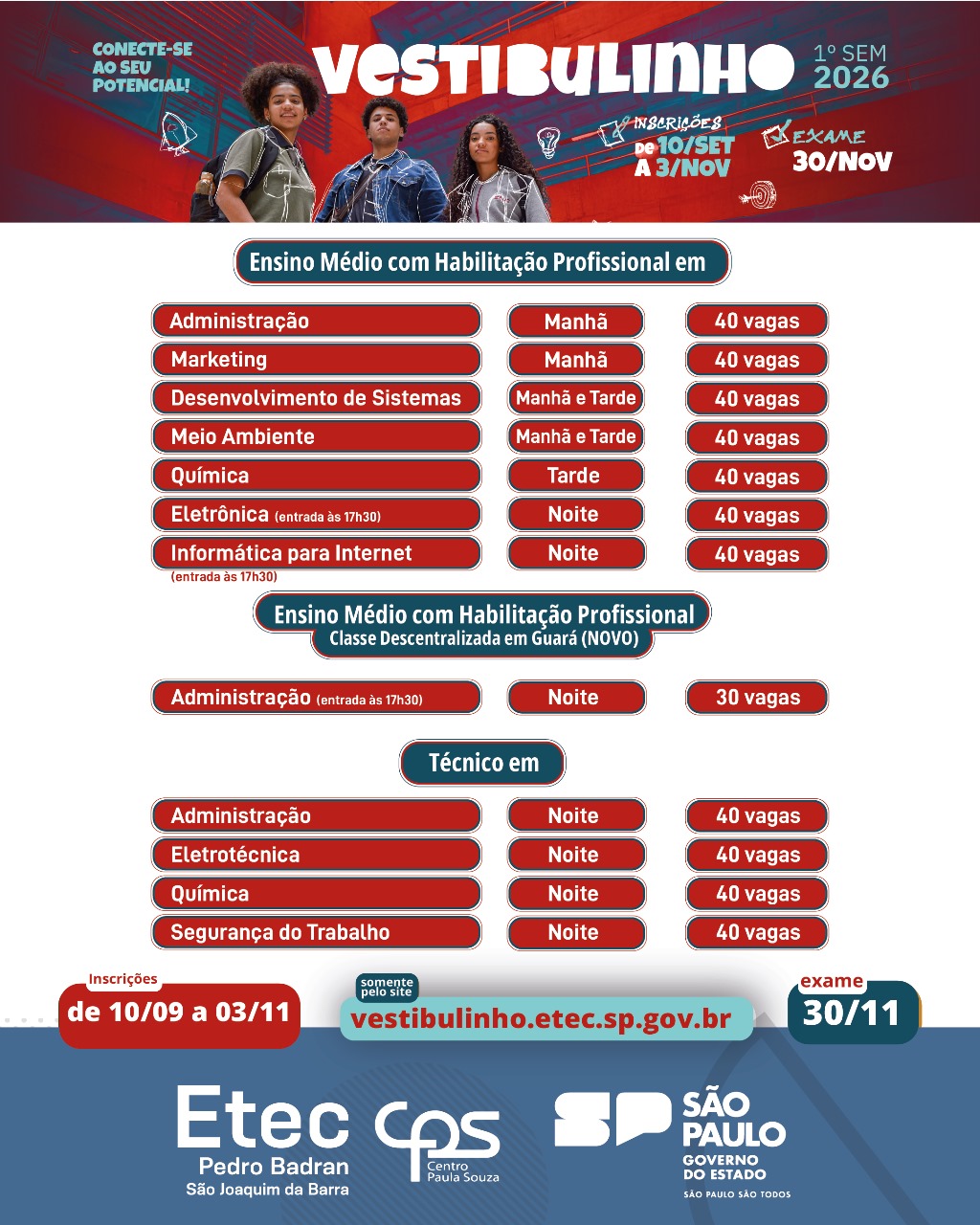 O vestibulinho da Etec Pedro Badran – do Centro Estadual de Educação Tecnológica Paula Souza-Ceeteps será realizado mediante processo classificatório, com o aproveitamento dos candidatos até o limite das vagas fixadas para os diversos cursos.